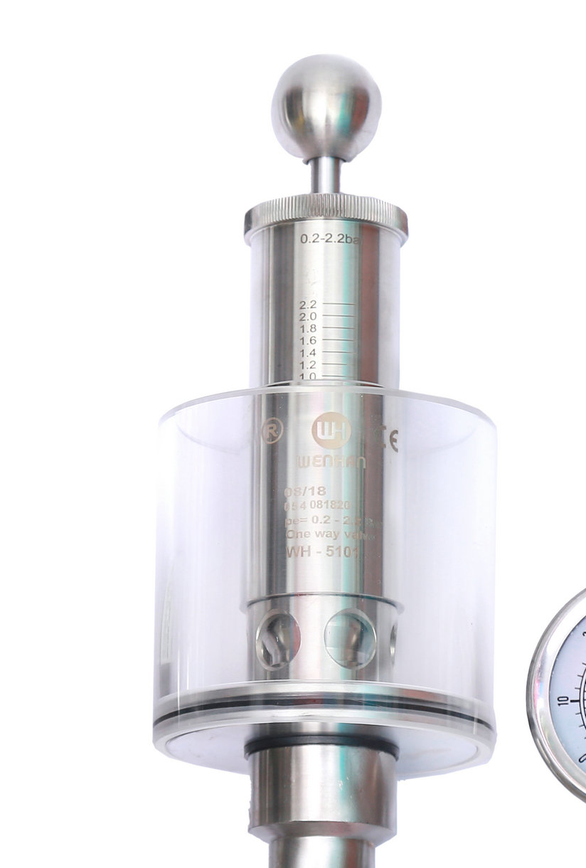 調節單向排氣閥保護容器壓力過高防爆作用,當壓力高于設定壓力(標準1BAR)時可以排氣,反之關閉,調節桿標上壓力刻度,所需壓力按刻度上調整,該閥門使用方便,刻度準確,玻璃罩加水能看到發酵效果,減少染菌。同時也可以滿足于各種生產工藝需求,適用于各種食品加工,啤酒,飲料以及制藥等各種工業領域。