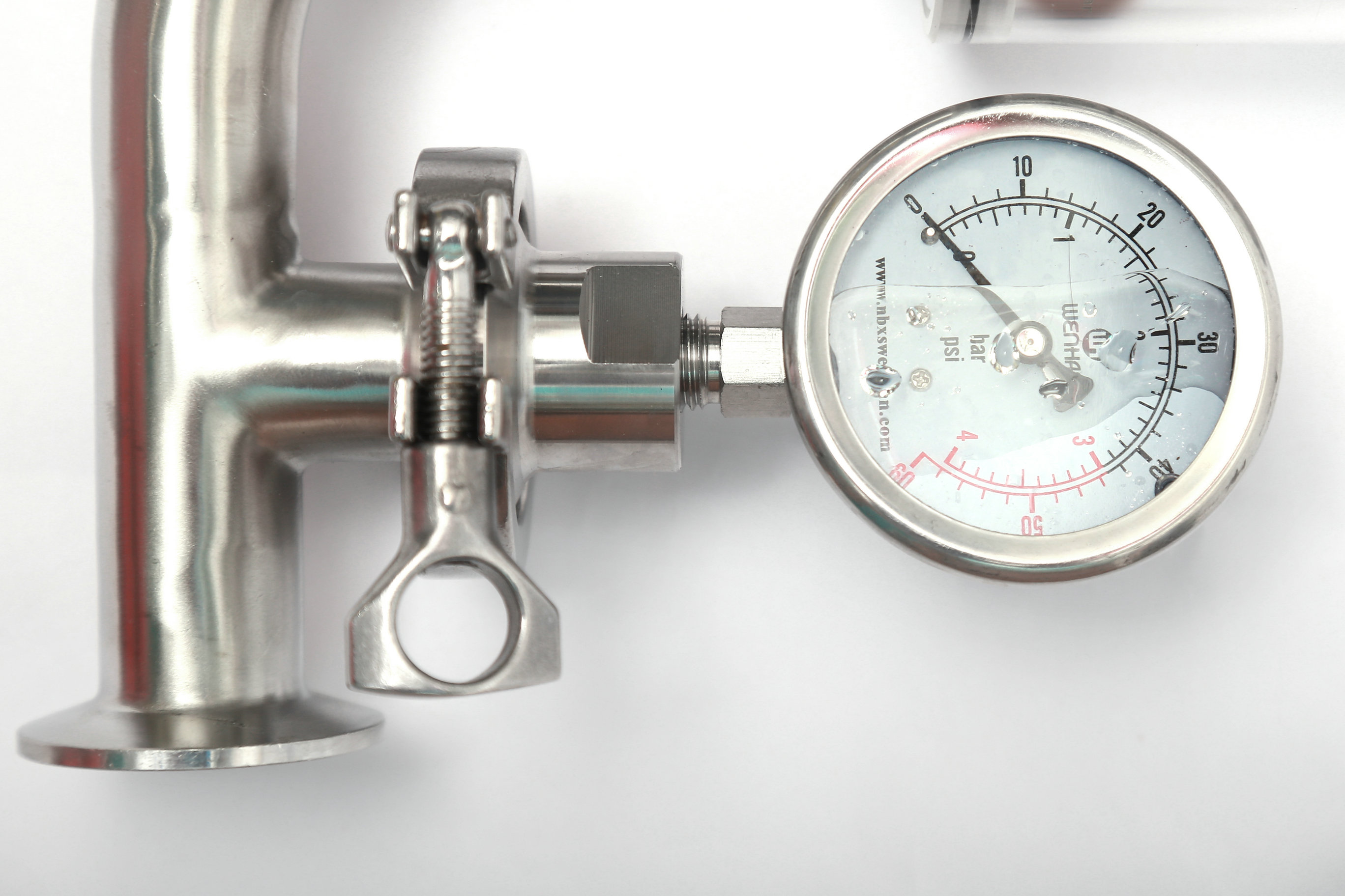 Wh-5101A鏈接;快裝 卡箍 隔膜式壓力表 ,隔膜卡盤Φ50.5,表盤Φ60 壓力范圍0-4bar 防震.手動式,旋鈕調節刻度壓力。